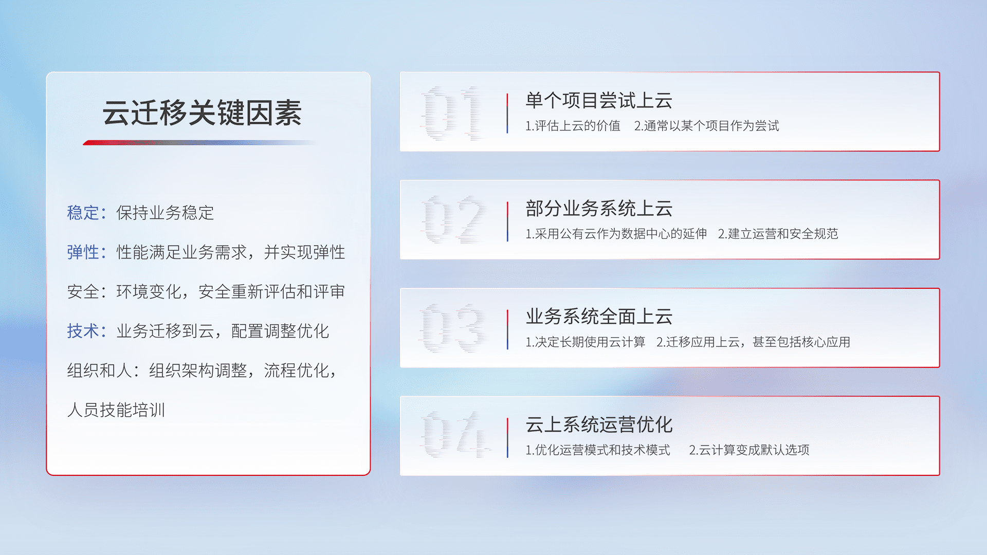 结合实际业务,,,从规划设计、、、、云平台选型、、云原生改造、、、、数据迁移、、、集成交付,,迁移全过程为客户识别最佳上云路径,,,做好风险识别管理,,,设计网络架构、、、、身份权限、、安全审计合规、、、操作审计、、日志审计、、、、监控告警策略、、、多站点容灾设计等,,对云上基础设施进行整体规划,,,,提升IT治理水平,,,以满足弹性、、、高可用、、高性能的需求。。。