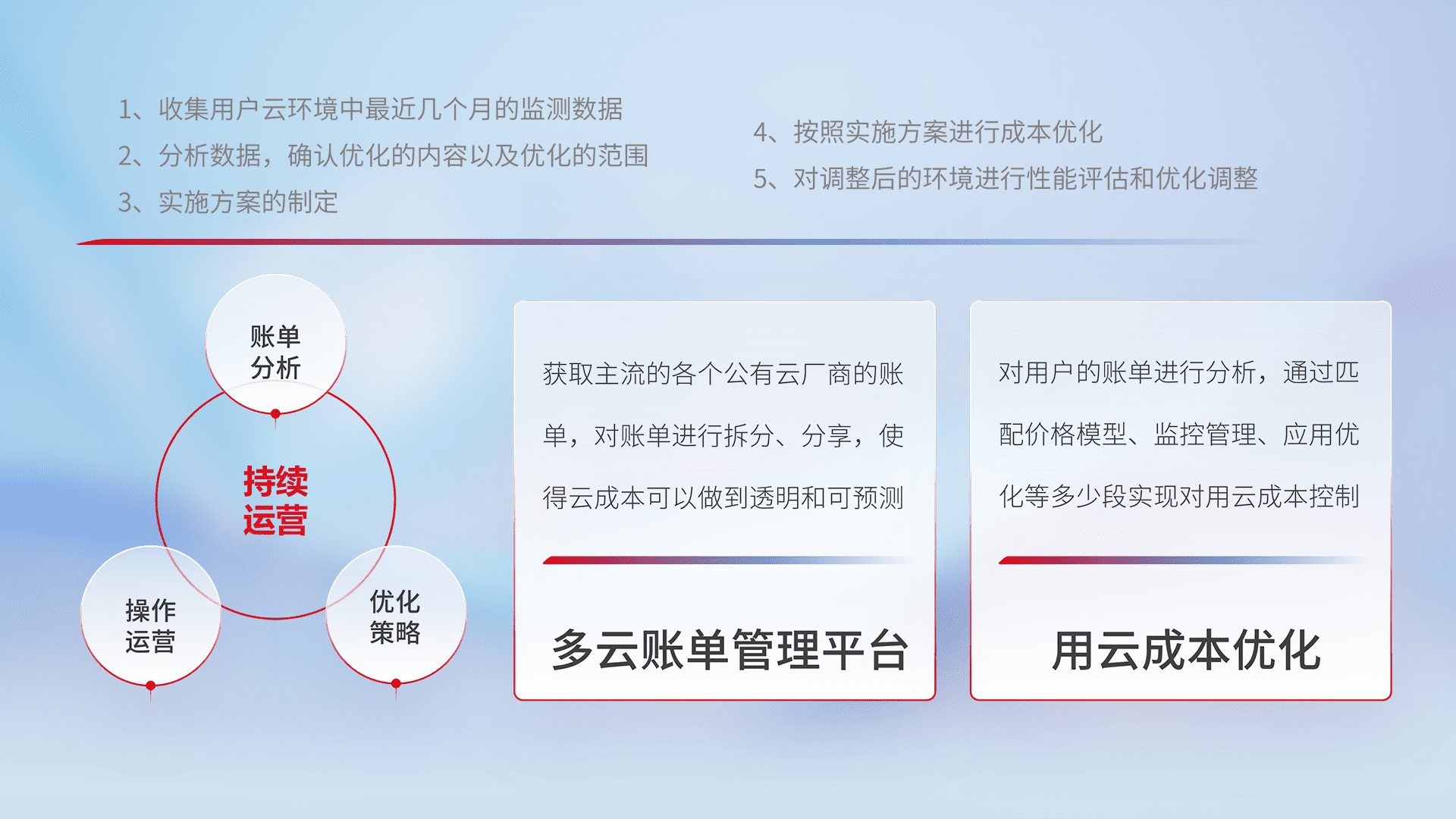 通过多云纳管,,,以统一的资源数据模型把客户的云资源进行抽象和封装,,,,进而实现对多云资源的统一操作,,,,保障云资源管理的可靠性、、、稳定性与可用性。。。量身定制化运维内容,,配置、、、开发运维、、补丁管理、、、备份、、、、监控、、认证和访问管理、、审计和日常巡检等,,,,保障在用云过程中的可靠度,,,,稳定度以及高可用率。。。。